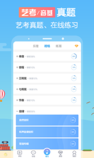 9、 丰富全面的学习练习内容,包含了音符、音阶、键盘、音程、和弦、节奏、旋律、调式等多种内容。