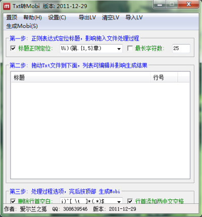 将文本文件拖动到列表框(窗口中最大的那个框)中, 按顶部右边的生成Mobi 菜单,然后就会生成mobi文件(有没有目录得看你的Txt的标题是不是 第xxx 章 这样的类型)