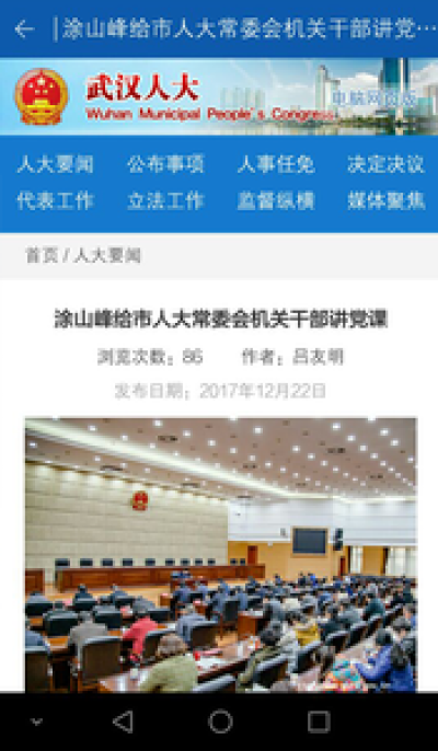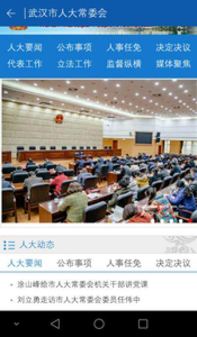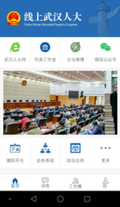 线上武汉人大(官方版)是以手机为终端的综合应用软件;包含人员办公功能,人大代表开会功能,即时聊天功能,个人信息维护功能,浏览信息功能。