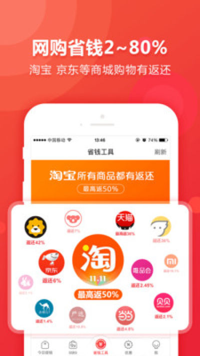 返还工具:通过返还购去淘宝网/天猫/京东/唯品会/一号店等800家商城购物,至高返利80%