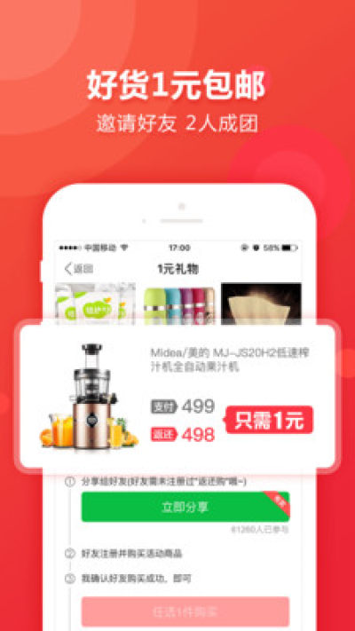 一元礼物:每天10点发放价值20元的1元包邮的商品,人人有份!