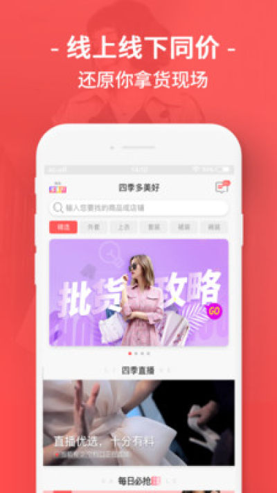 有了四季多美好,告别凌晨3点起床,下午2点吃饭的拿货奔波生活!主打直播抢货功能,每天和档口抢货全程同步直播,轻松动动手指,好货立刻拿下!