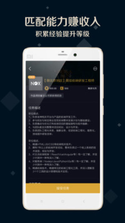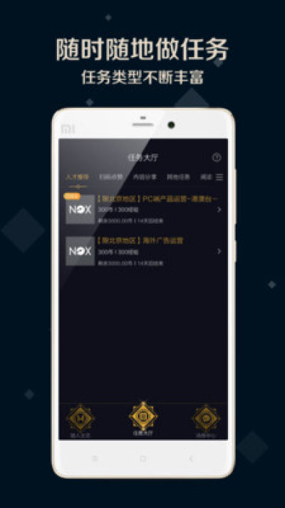 自由职业者做任务:设计、文案、技术等都可以在夜神猎人App里面选择与自己匹配的任务,赚取收益,无地点、时间限制,自由工作。