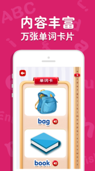 4 设计精美:APP由设计精美的操作界面以及美轮美奂的单词卡图片组成。充分考虑到儿童的特点,操作异常爽快,对孩子有很大的吸引力。