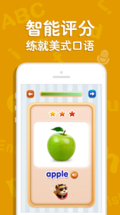 3 美式发音: 每个单词都有标准美式发音,设计了发音练习以及人工智能评分的功能,让孩子经过练习,可以发出标准的美式口音。只有会说,才算是真正掌握。