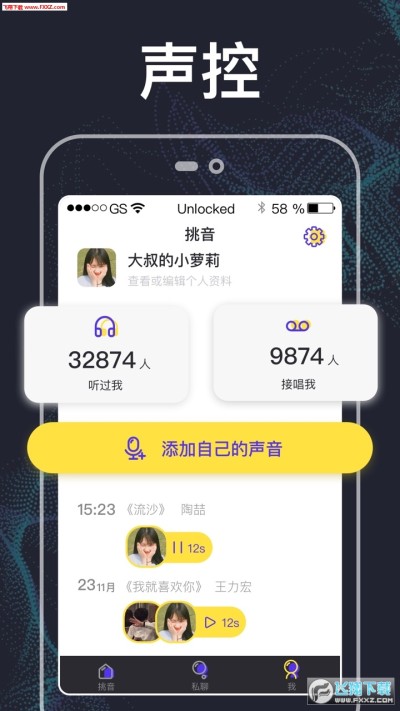 挑音是新一代的陌生人声音社交平台,主打接唱配对、声控交友。选择你喜欢的人接唱,如果对方也和你接唱,则配对成功,自动成为好友。