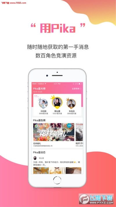Pika软件是一款娱乐性的手机app,这款软件可以为用户提供各种关于海量的真实表演信息,也是提供给演艺新人使用的,在Pika安卓版上用户可以直接查看最新的消息,还有各种人气榜单等等,感兴趣的快来下载吧!