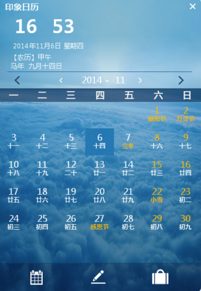印象日历是一款简约,小巧实用的电脑桌面日历软件。印象日历提供天气预报、万年历、农历、节假日、节气、24节气、老黄历、黄道吉日查询、年、月、日查询。