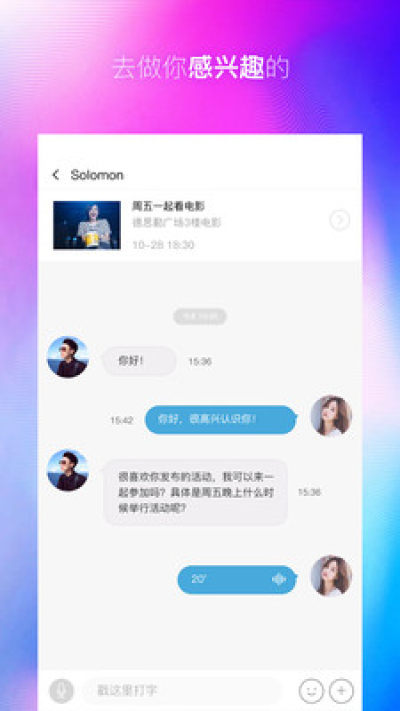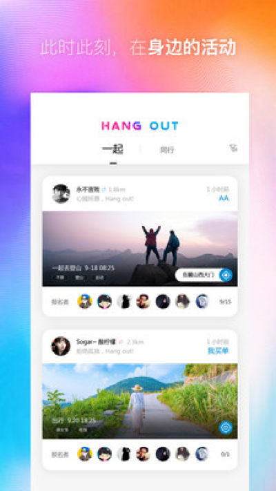 您通过一场场周围小伙伴们发起的的活动,在基于对其的兴趣,如果聊得投机,去报个名、发场活动约上一名或多名小伙伴一起“出去玩”。