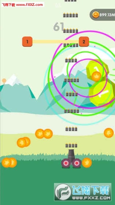 目标物理弹球根据物理轨迹自由掉落和弹起,每个弹球上都有各自对应的数字,表示击毁它需要的子弹数。每一颗大球被击落后会随机分裂成小球,也需要导弹来击毁。