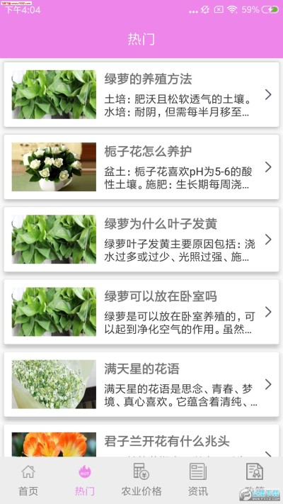黄金农场app是一款种植知识科普平台,在这里你可以了解到全面的花卉种植知识,喜欢养殖花草的朋友不要错过了,为用户提供针对性的学习,能够全面的覆盖养殖,还有关于花卉市场的知识,喜欢的朋友不妨来试试吧。