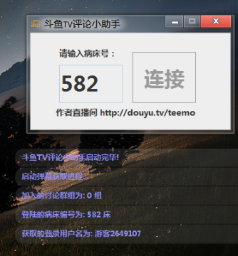 之后运行斗鱼TV评论小助手应用程序,在弹出的主窗口内填入需要获取弹幕的房间号码或者别名,点连接即可。接着的操作?没了,就这么简单!在启动完成之后小助手会有刷屏气泡提示提示小助手启动状态,可以依照这里的效果来测试自己设置的参数喔~