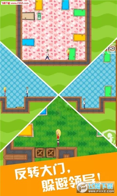 在游戏中玩家需要帮助安娜找到正确的门,顺利的从办公室溜出去。当然小心那些巡视的办公室经理。翘班遇上他们可不是好玩的。