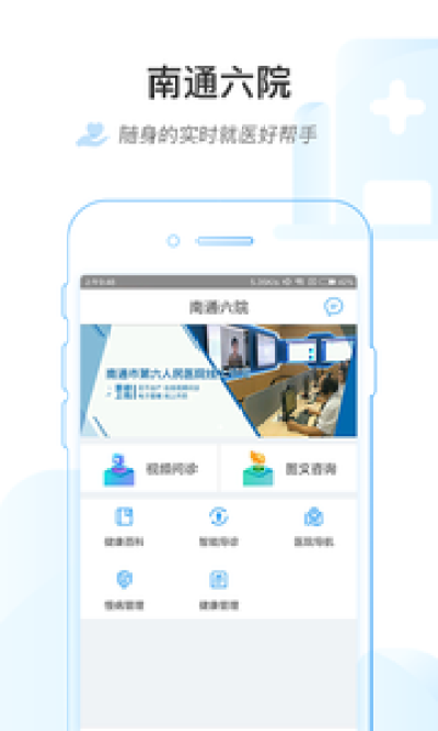 “南通六院”是南通市第六人民医院以移动互联网、云计算、物联网、大数据等特点“智慧化”信息服务。“南通六院”旨在医院现有服务基础上,通过视频问诊,图文咨询,智能导诊,健康百科等多种简化患者就医流程功能,减少就医等候时间,改善患者就医体验,提高医疗服务质量。