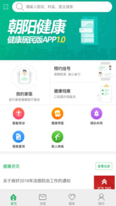 朝阳健康app提供朝阳居民找医生,找医院,查看报告,老年人检验预约,家庭医生服务等健康服务