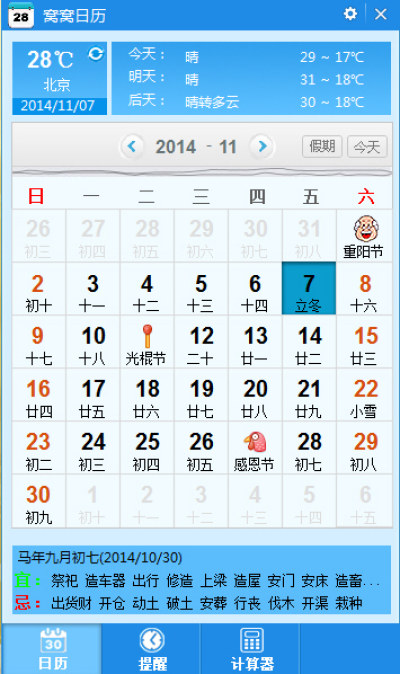 窝窝日历是一款小巧实用的桌面日历软件,完全免费,而且占用极少的系统资源,显示常用的阳历和农历节日信息,同时还带有计算器和提醒等功能。