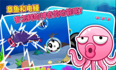 轻松有趣的游戏模式,轻轻点击手指便可操作,锻炼孩子的手指的灵活度,伴随着轻松活泼的音乐,梦幻般的海底场景,新奇而有趣。