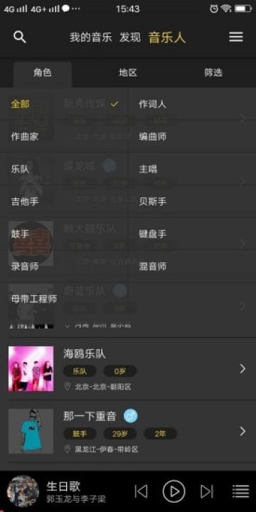 音乐人按身份、按地区、按性别、按年龄、按乐龄精准查找,360度搜索无死角,找乐手组乐队,寻找创作伙伴想来就来