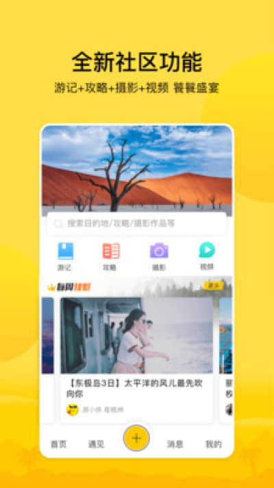 - 开启游记新玩法,像微信朋友圈一样发布旅途中的所见所感,和会玩的人一起在这里分享旅行;
