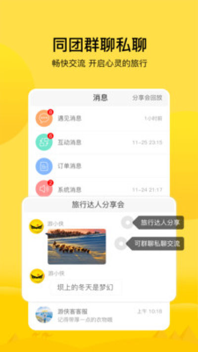 - 旅游约伴,同团交流、私聊团友,帮你约到暖男萌妹、摄影高手、户外达人,和有趣的人一起在路上;