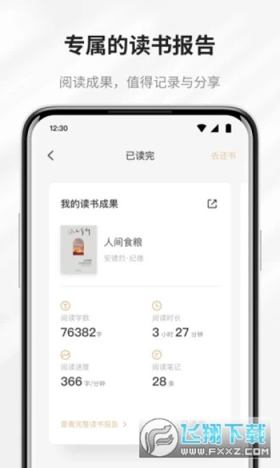 用户读的每一本书,都会为之生成专属的读书报告,记录用户与这本书之间发生的点滴。呈现阅读的核心数据,让用户对投入在这本书中的阅读时长、阅读速度等一目了然。