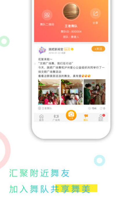 ·加入舞队:舞队秀,一起秀!快加入附近舞队,和附近志同道合的舞友做盆友,快把你的朋友介绍进来一起聊天和尬舞吧!