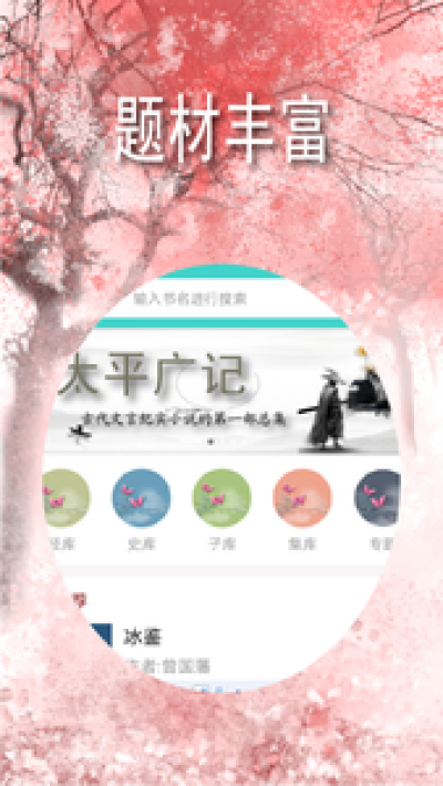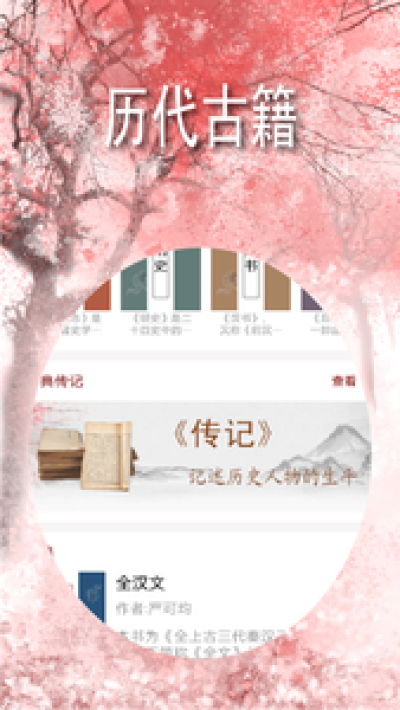 收录了大量的中国古籍,按经史子集收录中国历代古籍善本,包括史记,周易,诗经,尔雅,礼记,尚书,中庸,吕氏春秋,周礼,礼记,明史,三国志,论语,历史人物传记,十三经,总集,易经,诗词,全唐诗,全宋词,山海经,资治通鉴,古典武侠,古文观止,古典小说,古典名著,黄帝内经,了凡四训,说文解字,汉书,后汉书,晋书,旧唐书,明史,清史稿,史记,宋史,周书,道家经典,儒家思想,传习录,大藏经等等古文典籍,提供海量古典古文,传承国学经典。