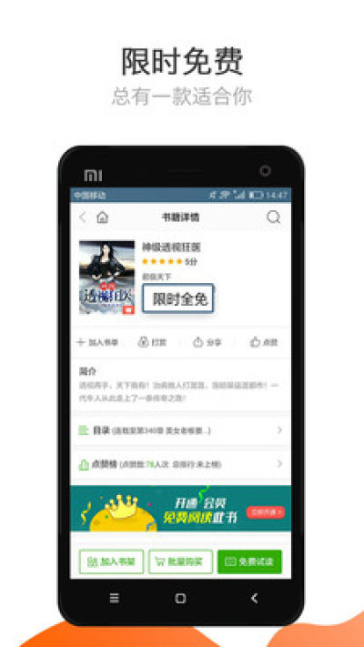 离线阅读:实现不同设备上的数据同步,把喜欢的图书全本离线下载,无论何时何地,享受高速流畅的阅读享受。