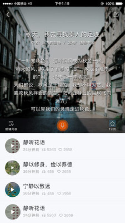 全民诵读,提供自由读享受听,用声音表露情怀,探寻灵魂栖息的诗意。为你提供海量素材,也可自写自读,邀请他人诵读,或用普通话,或用方言,选择古文今作,童谣寓言,心灵所感,外国诗歌……,把有声语言分享给他人,或将声音留存。彼此间相互订阅,及时了解对方新动态,对于认同的作品分享、收藏、点赞、或因共鸣而留下内心想法。