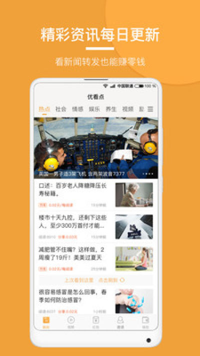 《优看点》app是一款最新的阅读赚钱类新闻资讯平台,为用户带来全网时事热点、搞笑视频、网络文章等精彩内容,不仅如此,用户还能通过阅读和分享来赚钱;需要的话就下载试试吧!