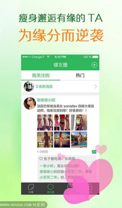 【帅哥美女准点监督】檬友小伙伴一起来瘦,只要坚持,没有甩不掉的肉!减肥路上没动力,没激情,不用怕,不用愁找到你的男神女神,一路陪伴监督,坚持就能瘦愉快交友,轻松减肥,檬友圈帮你一起瘦到底!