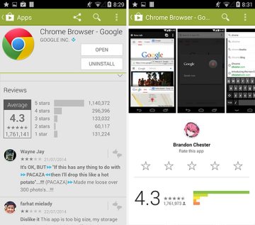 此外,Google还给应用评级添加了更多的颜色(上方右侧截图),而Play App本身也移除了大部分的水平线,整体看起来更加简洁。