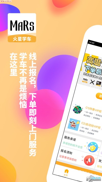火星学车有线上App和完整的线下培训服务体系。用户可以通过APP报名学车,也可以通过APP预约练车。