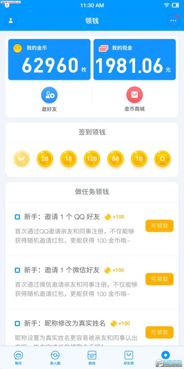 5、中国移动聊天宝的“领钱”栏目与趣头条非常类似,用户可以通过签到、“阅读新闻”、“发送熟人圈”、“扫码支付”、“点赞、评论”、“与好友聊天”等方式领取金币。