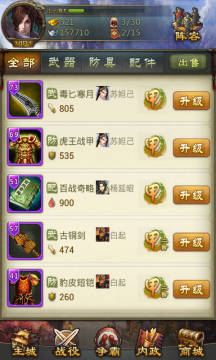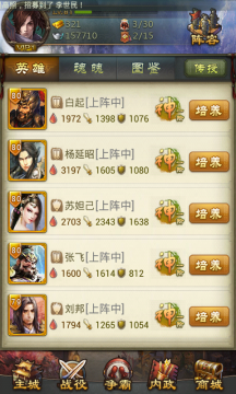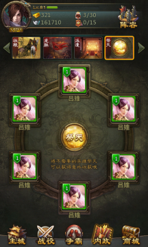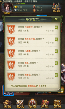 争霸开启后,每日可挑战15次(可购买)自己排名之前的玩家,提升排名,显示实力吧,争霸有一个细节,就是在点击挑战时会先看到自己的银子增加,后进入对战画面,因此可以根据钱增加的多少事先知道输赢,即游戏整个推演都在一下点击中完成,这里关系到阵容问题