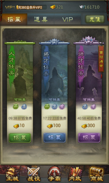 购买道具,vip,vip礼包,免费和金条招募的地方