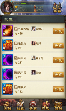 用粮草挑战关卡,升级主公和英雄,获得技能和装备,宝箱魂魄什么的,通关有关卡宝箱,全金通过某关卡可开启此关精英关卡,精英关卡掉落稀有魂魄,每天24点刷新,同时在开启新精英关卡时刷新,每开一个精英会刷新所有精英关卡,前期推图集中一个精英关卡可快速招募到此英雄,推荐苏妲己,因为妲己魂魄还会在关卡宝箱中获得