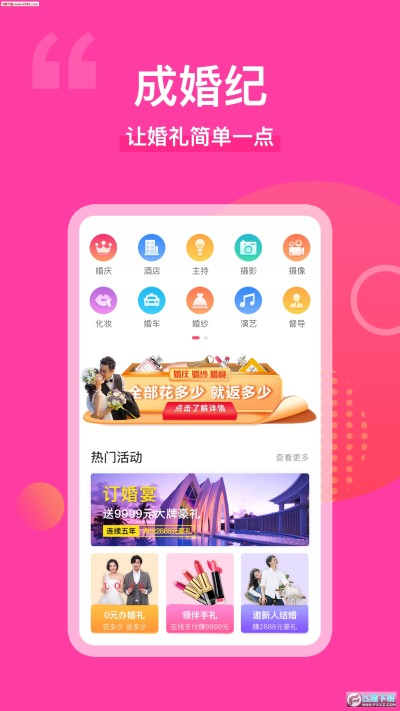 成婚纪是为新人提供婚宴、婚庆等VIP一站式服务的平台。新人通过平台即可享受“婚礼,花多少返多少”、“推荐奖现金”等福利,并有平台提供担保服务以解后顾之忧。
