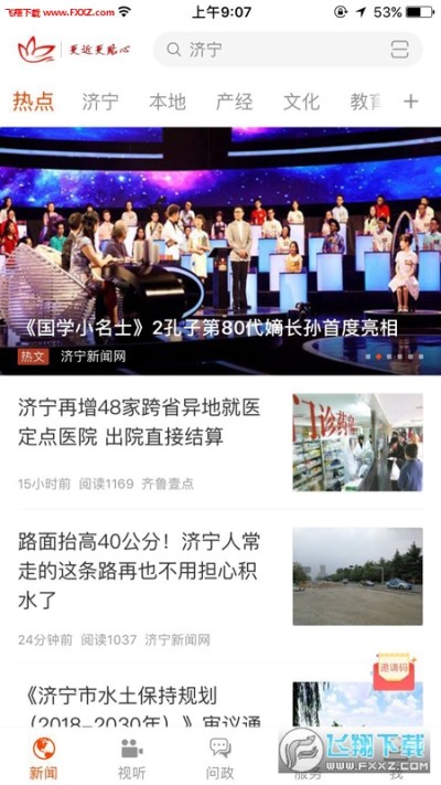 资讯模块设有热点、济宁、县区、产经、文化、教育、辟谣、公益、健康、曝光台等20多个内容版块,实现了基于LBS地理位置的本地信息推送和版块内容的用户自定义。