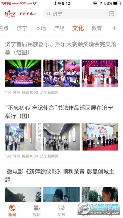 视听模块可直接收看(收听)济宁广播电视台4套电视节目和4套广播节目的实时直播,实现最长7天之内的节目回看和两天之内的节目预约收看;可以点播收看济宁广播电视台所有独家原创视频节目。