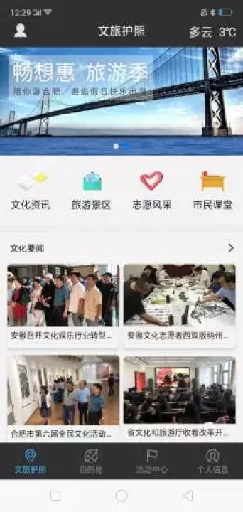 文旅护照app是一款由合肥市文广新局推出的手机旅游方面的app,这款软件为用户提供合肥地区的旅游服务,在文旅护照app上有当地的旅游信息,同时也有非常全面的资讯服务等等,在这里能体验非常良好的旅游服务哦!
