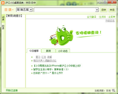 沪江小d日语词典是一款中日互译的学习软件,包含了中日互译所需要的词典文件,输入你要查询的内容,回车确认。在输入过程中,小D桌面词典会自动给出已输入部分的解释预览,预览不显示网络释义,网络释义在确认查询后加载。