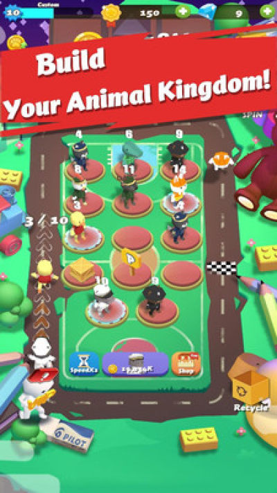 你需要不断地将动物合并来提升动物的品质,并且将这些动物放置到赛道中为自己赚取金币,不断地驯化下去最终融合出神级动物。