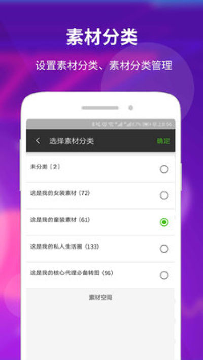 用户对自己发布的素材可以做分类,比如“这是我的童装素材库”“这是我的女装素材库”“这是我的私人生活圈”等。