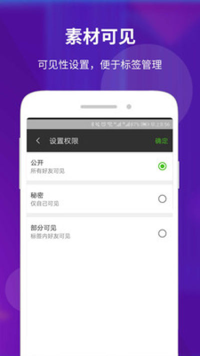 针对每个素材分类,都可设置对应的标签好友可见,对素材的私密性,做到了比较人性化的管理
