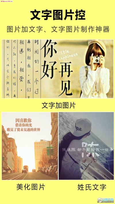 文字图片控是一款时尚文字图片制作APP,用户可以快速在图片上加文字(支持自定义字体样式大小,颜色,各种常用字体类型)可插入图片进行贴图拼图 。