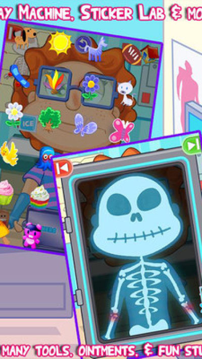 X光检查病人是否有骨折,然后把他们扔到贴纸实验室,在那里你可以用各种各样的贴纸和有趣的玩具装饰病人!!