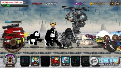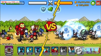 火柴人战争模拟器类型,小编才发现里面的火柴人形象都是欧美超级英雄,初始默认角色只有一个金刚狼,之后会相继解锁死侍、蝙蝠侠、钢铁侠、美国队长等等一共20位英雄,战斗模式就是等能量增长,到一定数值你就可以派兵,然后与敌方对抗,这边比较好玩的一点是它可以单独控制里面的小单位,当你单击选中某只单位之后,它的头顶会有一个领队标志,你不仅可以获得方向键和攻击键、技能键,而且还能带领其他队友移动,这样有利于你控制其他单位。。