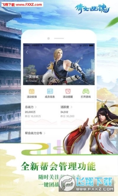 4、帮会-同步游戏帮会数据,查看帮会联赛、战力等数据,并提供帮会活动提醒,公告查看等功能;