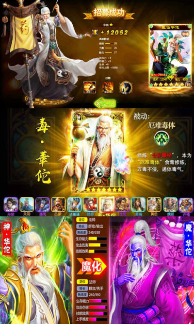 《毒王华佗传海量版》是一款q版三国题材卡牌类轻游戏,在传统手机页游上进行了极限挑战,展示真正的巅峰画质,完美诠释2K屏幕手机的至臻高清优势,而特效动画方面,同样也可震爆同期新款手机配置(手机撑不住建议电脑端兼顾同玩);然而这仅仅只是基础,玩法上也进行了各项突破,真正千人同时在线击杀了boss,武将多样培养,阵容多种搭配,日常副本海量资源获取,海量货币天天赠送,百层高塔等你挑战,多样玩法让你获得极致游戏体验!